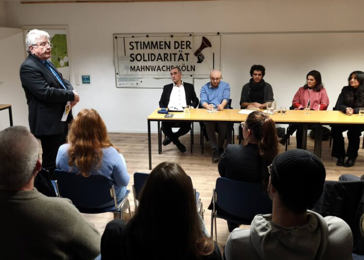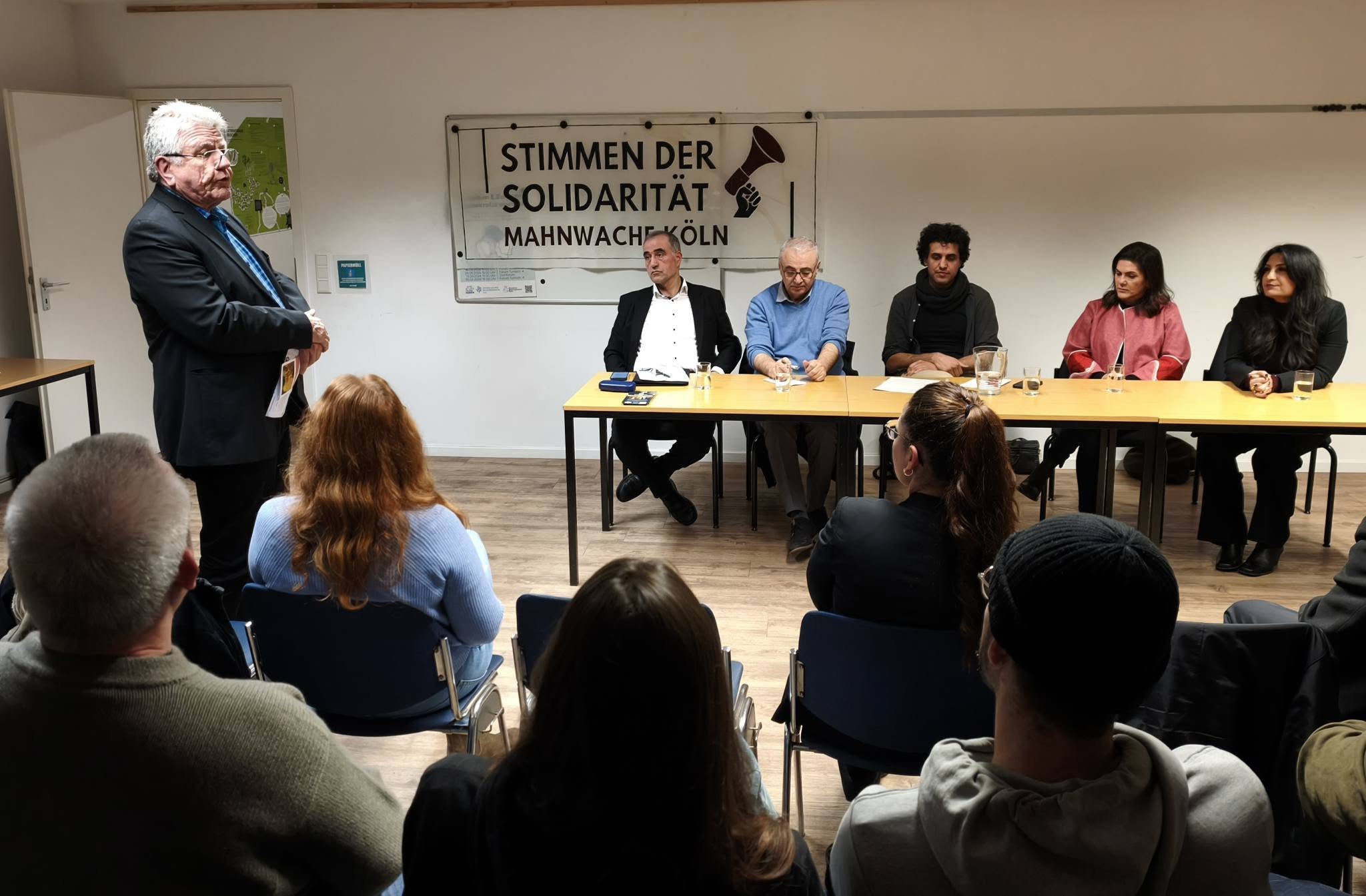 Zu Beginn richtete Dietmar Ciesla-Baier, Vorstandsmitglied des Friedensbildungswerks, ein Grußwort an die Anwesenden. Er betonte die Bedeutung politischer Bildungsarbeit, internationaler Solidarität und öffentlicher Aufmerksamkeit für die Protestbewegung im Iran.